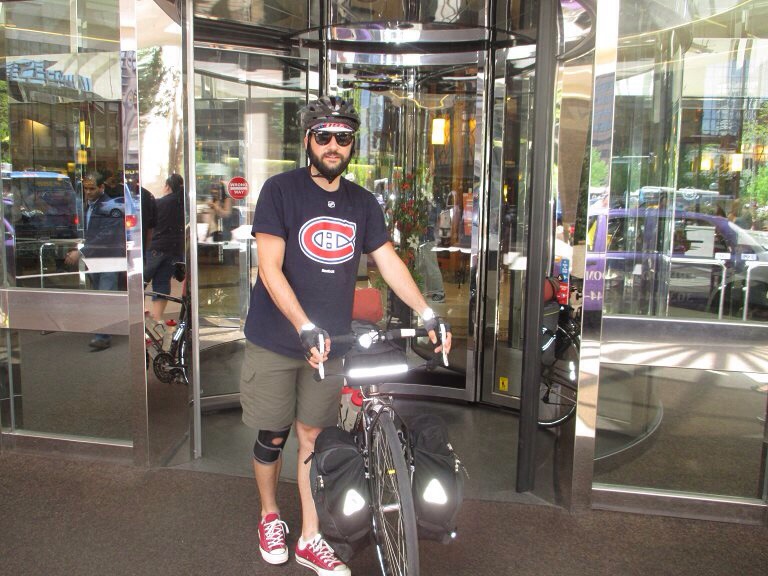 L’arrivée devant les voituriers de la célèbre chaîne hôtelière en vélo est assez cocasse. Dans ce genre de voyage, l’improbable se produit constamment et nous passons régulièrement d’un extrême à l’autre. Hier nous dormions sur des canapés, ce soir nous dormirons dans un 4 étoiles et demain soir nous camperont sûrement.