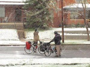À notre réveil (4h du matin – décalage oblige) les 24 degrés ont fait place à la pluie. Une pluie qui perdurera tout au long de cette première journée américaine. Au matin suivant, la pluie s’est transformée en neige. La prophétie du douanier semble en marche. Nous nous rendons au terminal de bus dans le but d’embarquer pour Granby.Après 1 heure passée à emballer nos vélos, un haut parleur annonce que notre bus est annulé en raison des intempéries. « Allo?!.. Luis et Whitney, ça vous embête si on revient une nuit de plus ? ». Nous déballons à nouveau les vélo, retour à la case départ !