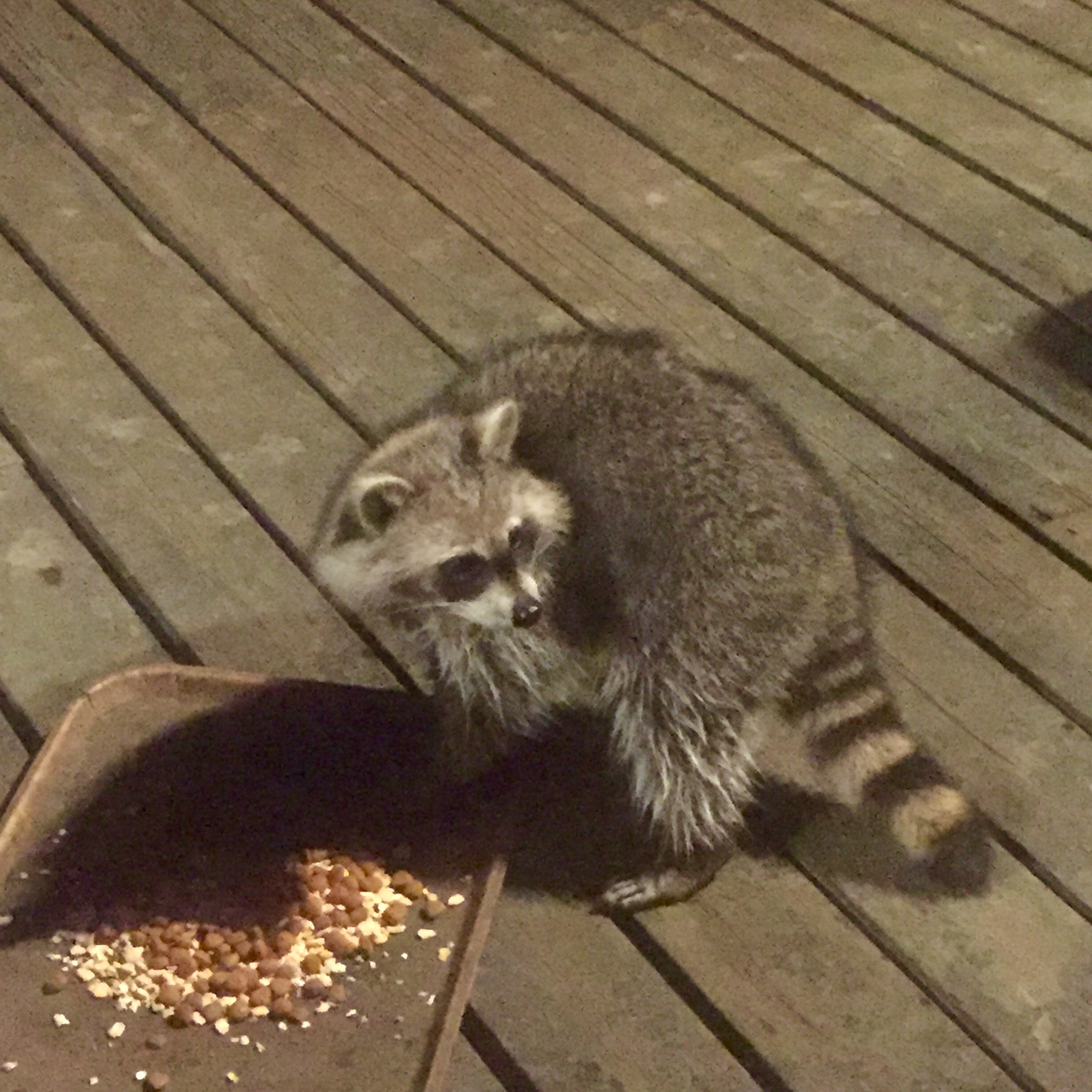 un raton laveur se délectant du reste de la nourriture des chiens
