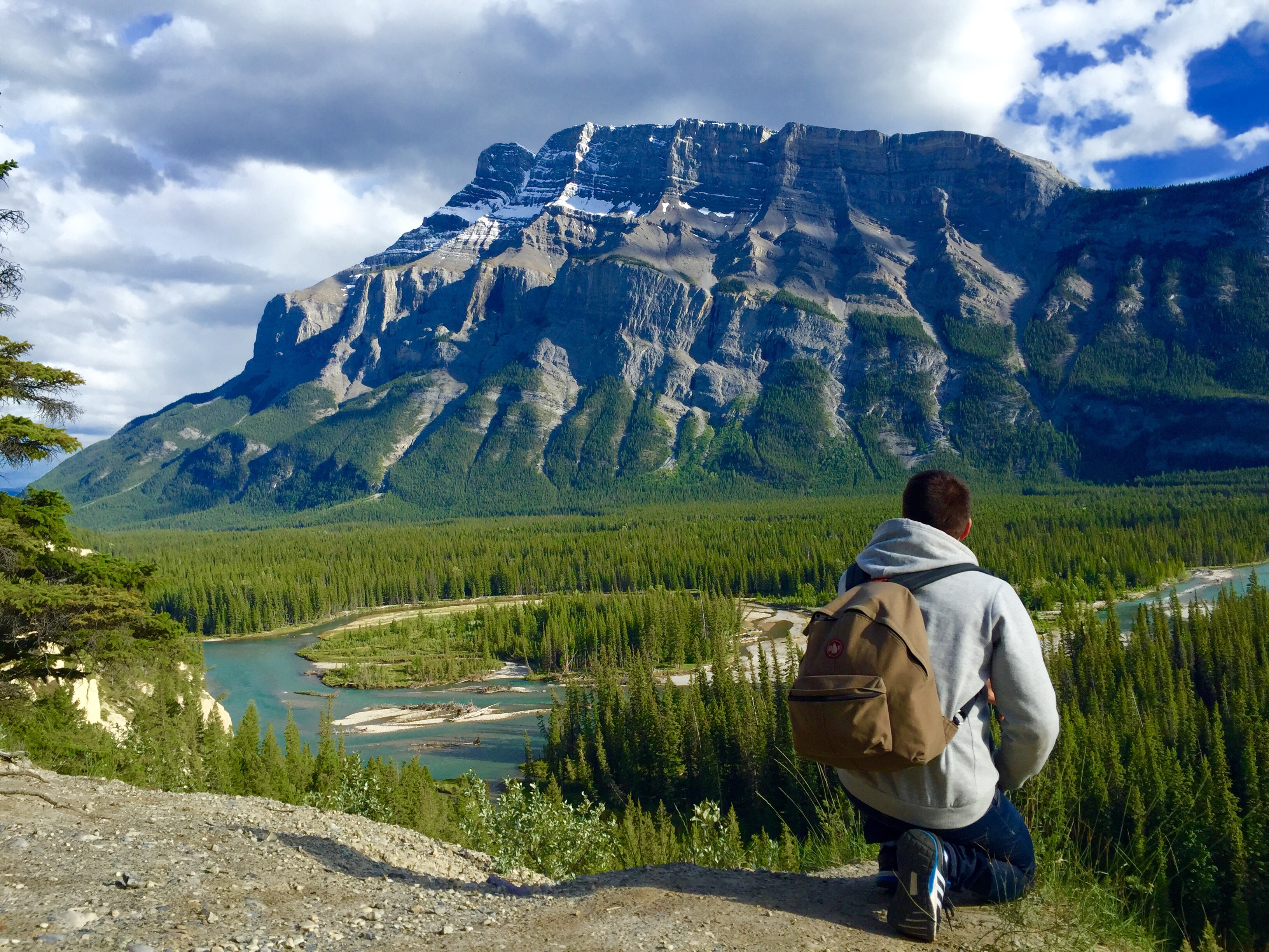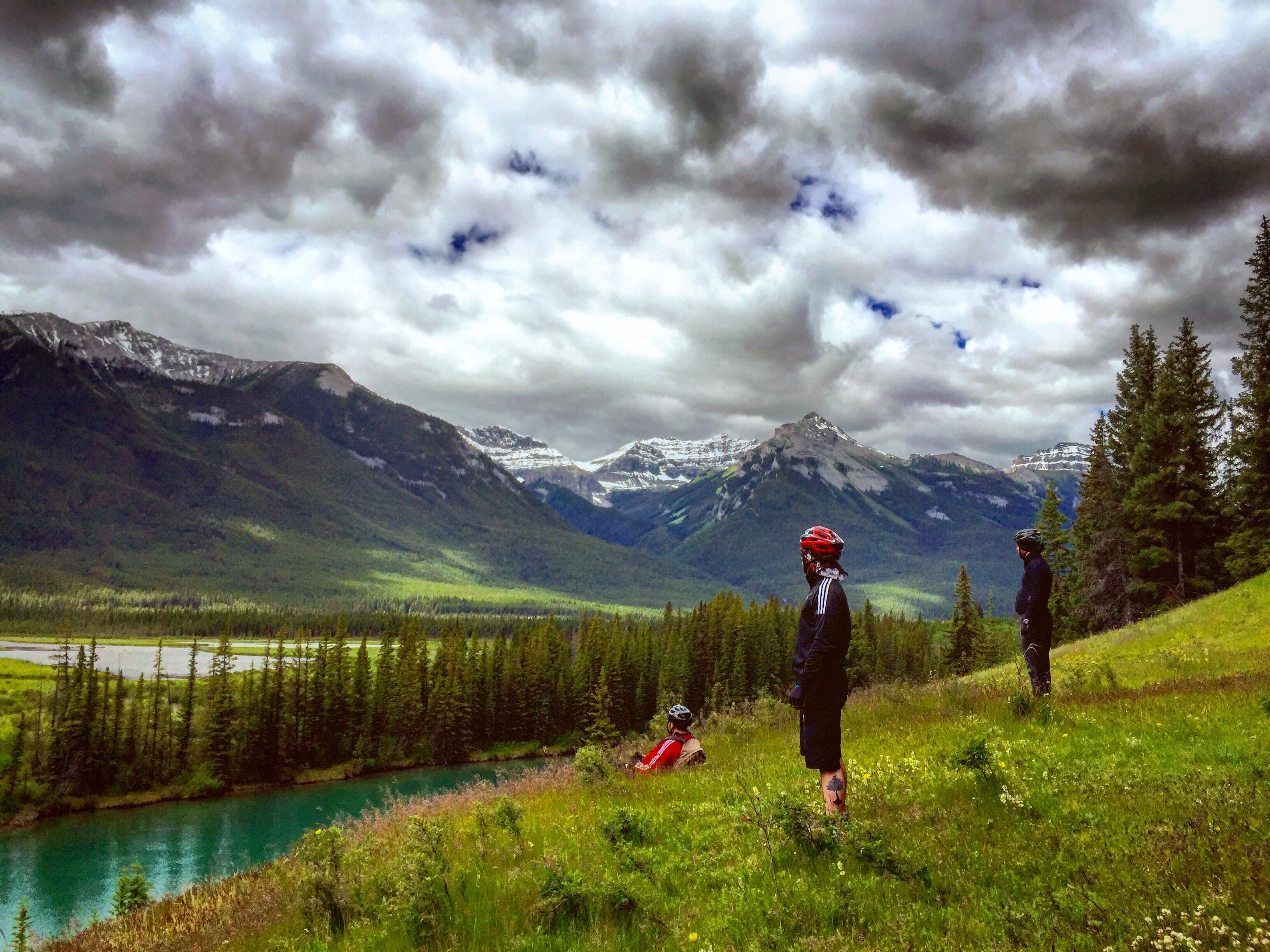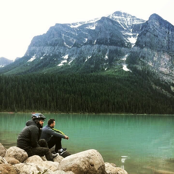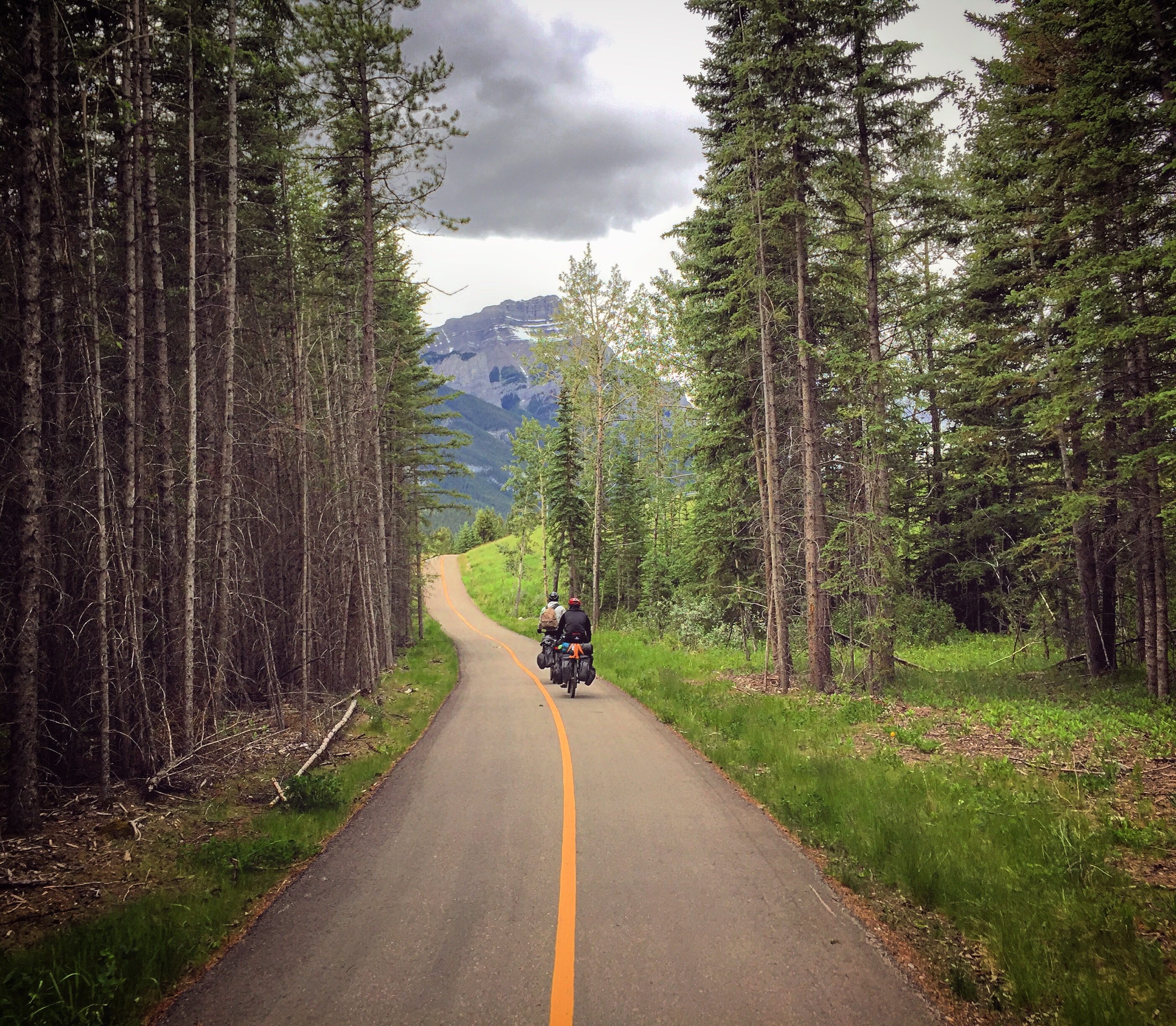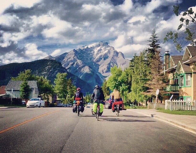 Bien reposés après cette intense halte à Canmore, notre épique chevauchée dans l’ouest canadien peut véritablement commencer. Près de 450km nous attendent jusqu’à Jasper. 450km au cœur des Rocheuses. La première étape: Banff, distante d’une petite trentaine de kilomètres, intégralement sur piste cyclable. Ce tronçon est un véritable havre pour cyclistes. On y croise autant de vélos qu’il y a de voitures sur l’autoroute. Malgré un léger vent de face et un ciel incertain, nous parvenons à Banff sans encombre. La ville fait fortement penser à ces stations de ski huppées des Alpes. Hôtels chics et boutiques de luxe constituent l’essentiel du tissu économique. Dernière véritable poche de civilisation avant Jasper (notre destination finale) nous en profitons pour faire des réserves de vivre.
