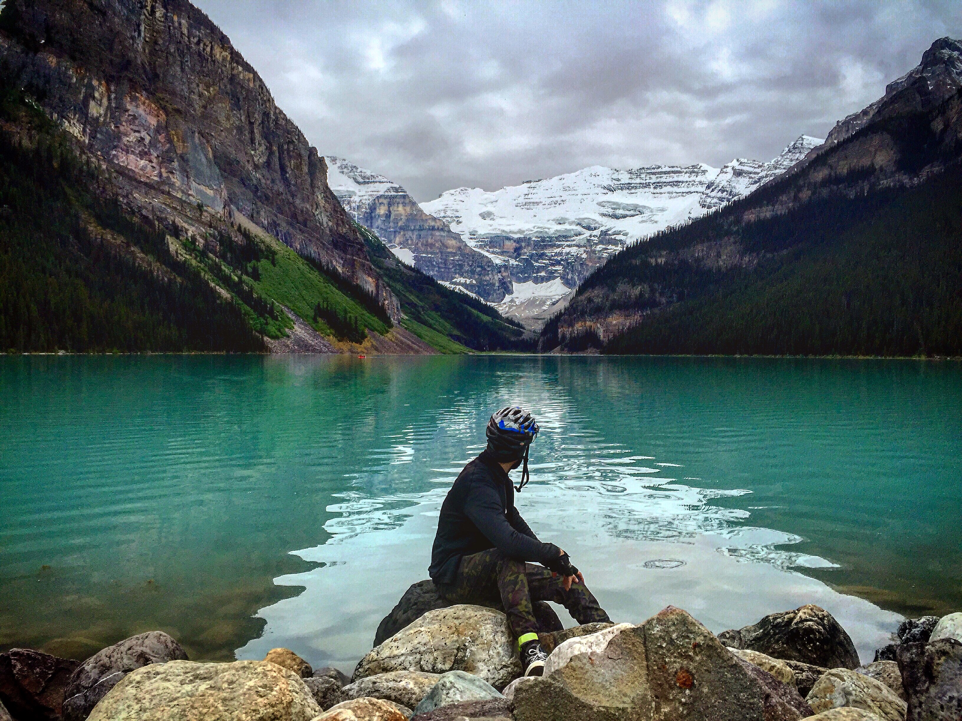 De Banff, nous nous dirigeons maintenant vers le célèbre lac Louise. La route qui y mène est parsemée d’instants cartes postales : lacs, rivières, sommets enneigés… Toutes les images d’Epinal évoquant le Canada y passent. Nous passons plus de temps à admirer le paysage qu’à véritablement pédaler et atteignons finalement les environs du lac Louise tard dans la soirée. Il reste juste assez de luminosité pour monter les tentes et se coucher.