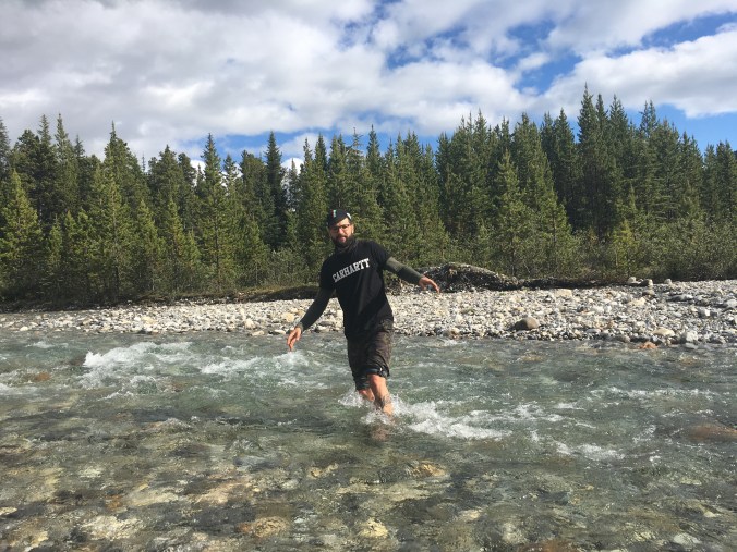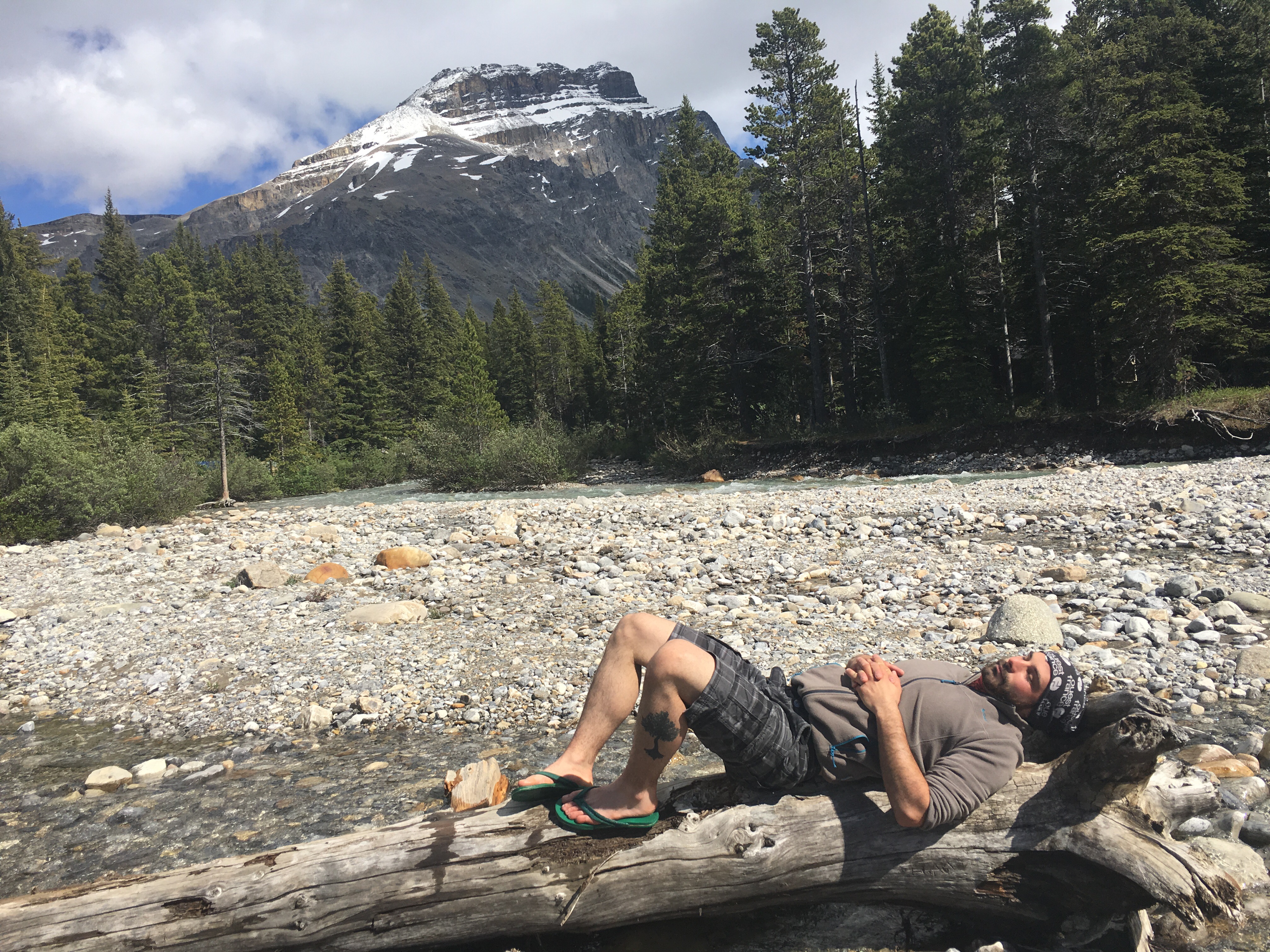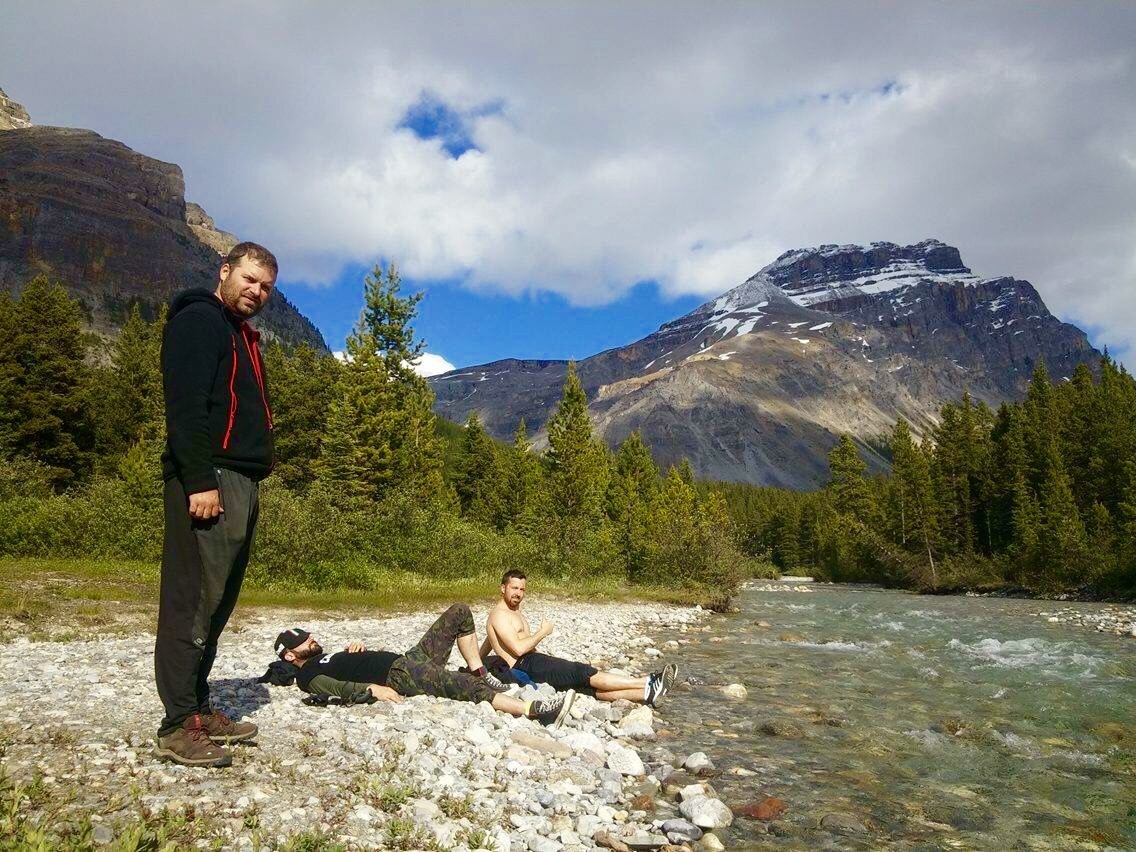 La décision adoptée à l’unanimité, nous quittons l’hôtel de fortune et montons le camp au bord de la rivière. Comme prévu par la météo, les rayons du soleil finissent par déchirer le voile nuageux, laissant apparaître les imposants sommets rocheux qui nous encerclent. Nous en profitons pour laver du linge dans la rivière et même faire une petite sieste bercés par le bruit du courant. Plaisirs simples mais si précieux car si fragiles dans cet ouest canadien sauvage.