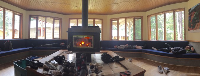 Une jeune gérante bénévole nous ouvre mais nous annonce que malheureusement tout est complet. Figés devant la porte de l’établissement, nous grelotons de froid tandis que la neige continue de tomber sur nos casques. Derrière l’aubergiste, un feu de cheminée crépite, des gens jouent de la guitare et savourent un café chaud. Le désarroi qui émane de notre regard à ce moment précis doit probablement valoir tous les discours. L’hôte nous ouvre finalement les portes et offre que nous dormions dans la pièce commune près du foyer… La délivrance.
