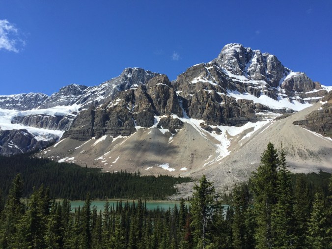 Comme évoqué à l’instant, lentement mais sûrement nous parvenons à vaincre le géant. Un géant de glace puisque le sommet est recouvert d’un immense glacier millénaire. Nous entrons par la même occasion dans le parc de Jasper, 110km nous séparent désormais de notre destination finale dans l’ouest nord américain.