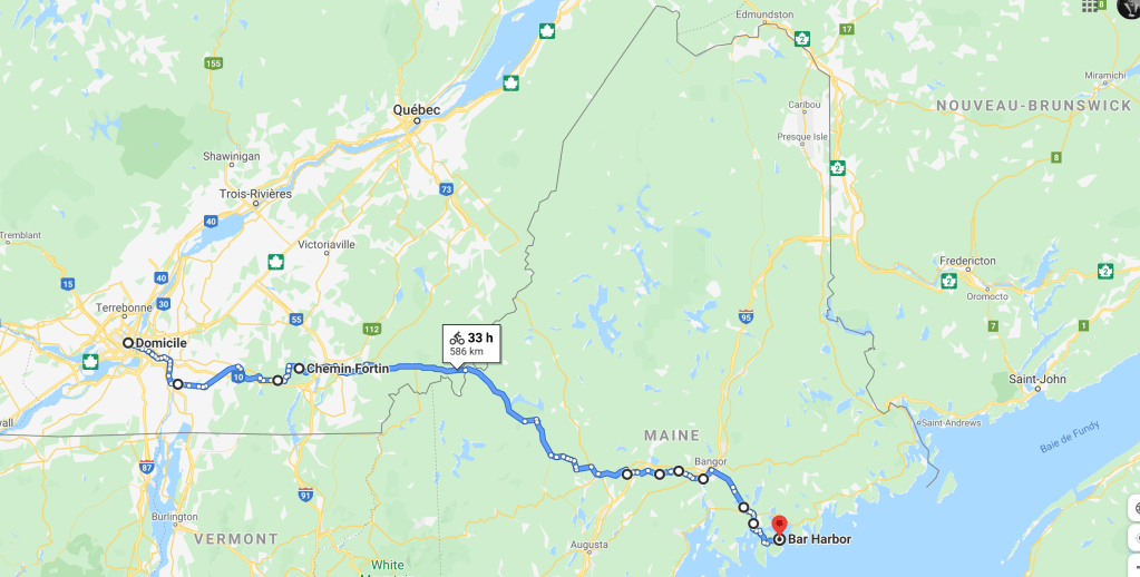 Nous quittons la demeure de Brett et Mary-Ellen à trois, direction l’île du Mont Désert et plus précisément le village de Bar-Harbor, destination finale de ce mini périple. C’est une petite dernière journée qui nous attend puisque qu’environ 70km nous sépare de la ville côtière. D’ailleurs, très vite l’influence du littorale se fait sentir: le vent se lève, chassant par la même occasion les mouches et les moustiques mais apportant avec lui les goélands et l’air iodé.